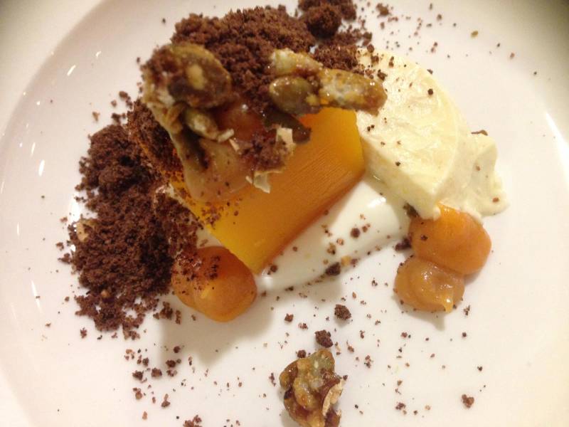 Zoete aardappel / pompoen / yoghurt-pompoenpit-parfait / koffie crumble / caramel